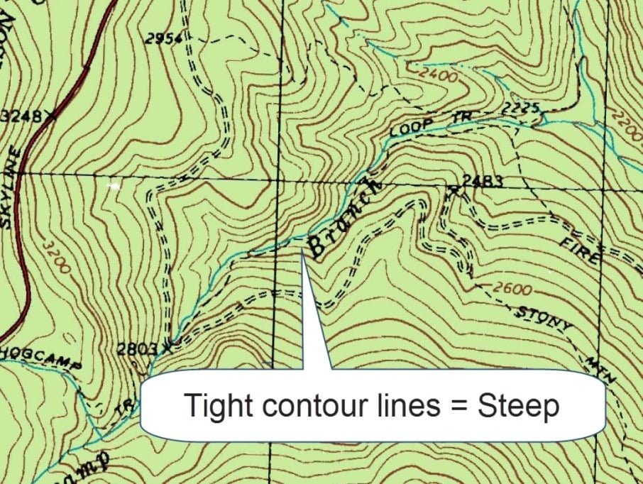 Waterfalls are usually not marked on the map unless they are prominent. In the example, this stream has two waterfalls indicating robust flow and promising water. There is often a good, deep fishable pool at the base of every waterfall.