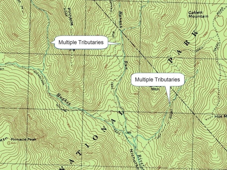 This rule is the opposite of avoiding intermittent streams. Find a blue line being fed by other blue lines. The larger the main stream, the better the possibility of year-round trout survival. Also, some tributaries may be fishable streams as well; allowing you to use one hike to fish a variety of water.
