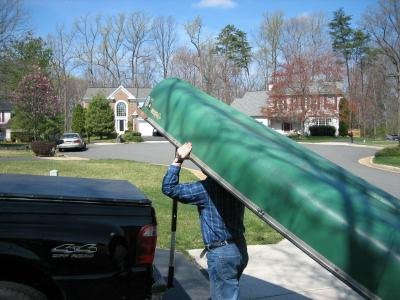 In the past, I would put the foam blocks on the canoe rails and in one motion hump/hoist it over my head with my wife being choreographed to grab the very front of the boat to lift it up. This thing is not well balanced and needs an extra push from the pit crew to straighten it out. Then, I would do a bench press and put it onto the roof and tie it down. Pretty tough work given the awkwardness of the canoe and the fact that it weighs 83 pounds. So, when I saw this thing, I was excited. Here was an easy way to load the beast that would not require my wife’s involvement. In fact, they showed a woman doing it on the picture! Sweet!