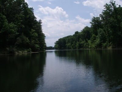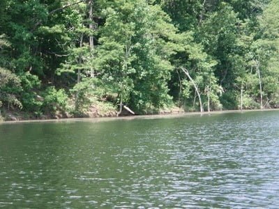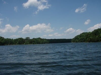 The parking lot is decent and there’s even a small bait store perched on the hill overlooking the fishing dock and boat ramp. I was startled to see the intense traffic and activity buzzing around the lot. It was full of cars, trucks and boat trailers with people spread along the shore fishing, sunning and having a good time. I looked out onto the lake and, as far as I could see, there were boats and canoes whipping fishing rods at the deep green shoreline. Well, we were here, so we threw the canoe in the water and decided to head up the east finger.