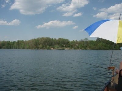 As I gave up in the center, I was disappointed to see that another boat had taken a position at the good spots along the eastern shore up the bank from where it joins the dam, so I motored into a cove populated with stumps. About the time we arrived, there was a huge splash in the middle. I’d forgotten that there is a golf course bordering the lake; something you would not immediately see since the course is protected by thick band of trees.