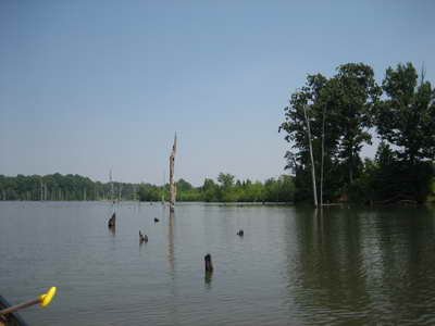 Curtis fit the bill, so we headed over there, arriving around 1400 or so. There is a concrete boat ramp at the tail end of the parking area. that is pretty gentle – looks like it would be easy to dump a jon boat into the lake. Not a problem for us as we executed the immediate action drill to unload the canoe, rig up and hit the water. I was immediately impressed with the lake. Not only were there only two other boats on the lake, but it was full of great looking structure – tree stumps galore!