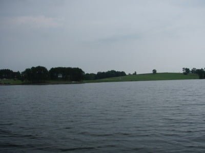Bad call. A few minutes later the rain started to hammer down. I put the trolling motor into high gear and made a beeline back to the truck. We decided to wait it out since we were already here anyway. Thankfully, it was only a passing shower, and we were back on the lake in about 15 minutes. This time, as we motored out, I noticed that the water right in front of the boat launch was deeper – running up to 15 feet. In addition, I was picking up plenty of fish marks on the depth finder in this area. It looked as if this “deeper” area ran right up to the bank on the peninsula across from the boat ramp, so we worked that area. Moving south along that far bank, we were picking up plenty of bluegill but no bass. As we rounded the bank, the sky started to rumble again. Being an optimist, I told the Basswife “maybe it will pass to the north of us” as we continued to fish the bend. The depth of the water here seemed to be consistent with the depth in front of the boat launch and not as shallow as the northern track.