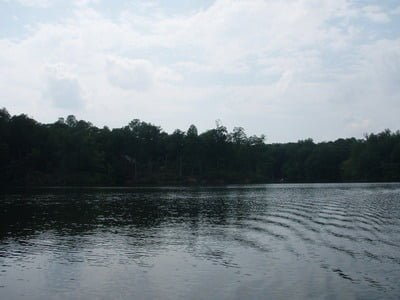 I decided to fish the first point sticking into the lake that formed the perimeter of the immediate eastern shoreline and was happy to find that the water was not excessively deep off that geographic feature. Up next to the shore, it was averaging between 10 and 15 feet with a gentle slope leading out from the finger. We didn’t pick up any bass in the spot, and as we rounded the corner, we ran into another boat. Not wanting to fish over the same water where he had just been, we headed across the lake to work the cliff face that formed the key structure on that side.