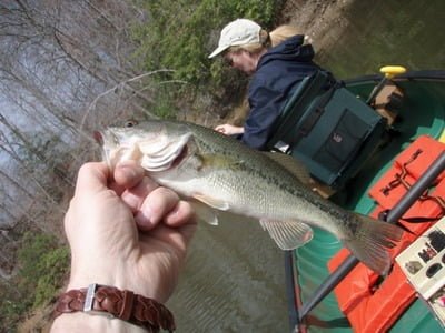 The Basswife quickly hooked up a nice little guy who looked really, really cold and not althogether grateful as I popped him back into the 59 degree water. We worked our way up to the end with no other bites. Once at the top of the feeder, we motored back out to the main run. On the way out, I noticed another boat made a beeline right to the shore marked on the map – maybe they know something more about the structure here. I’ll have to check that section on my next trip.