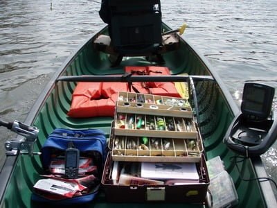 Rod holder on the left keeps my extra rod from tangling. GPS perched on my worm bag, array of weapons laid out and then the PiranhaMAX 30 depth finder on the right.