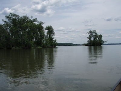 Looking to the west, it appeared that there were some grassy areas and since there were no big boats up there, we moved as quickly as we could in that direction. Bad choice. This is really, really shallow at the west end of the inlet. The water was only about a foot deep to either side of the main channel and even the small trolling motor hung off the back of the basscanoe struggled to chop through the submerged vegetation. A loser.
