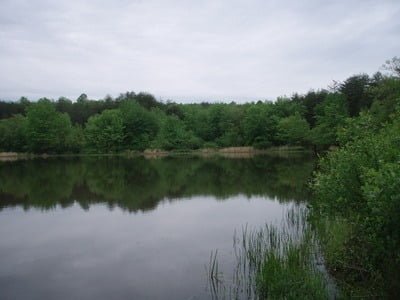 The gravel road that leads to the pond is wide and easy to walk on. It leads directly to the southwestern tip of the Range Six Pond. As the pond heaves into view on your left, it’s only a short bushwhack through some high underbrush to get to the edge. Once there, you can stand on the high bank and survey the pond. To your right is a built-up berm with a small metal pier that juts out from the middle. The berm holds the deepest water in the pond and is large enough to walk on. To the left, the shore winds around and is protected by close brush and trees, which will make a backcast difficult if you are going to fly fish. The far side of the pond is the shallow water.