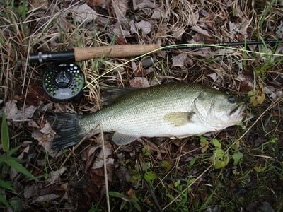 Being right-handed using my fly gear, I decided to work around the shore to the left. That would put my casting hand next to the water and make it a little bit easier to avoid the brush that hugs the bank. There is a scattering of aquatic plants that poke out of the water near the shore, and I decided to target those. Within a cast or two I started to pick up my buddies, the bluegill. I was working a terrestrial pattern — a grasshopper — even though it was early in the season. About a half-hour into fishing, I was rewarded with a huge slurp and the visual treat, a big bass hitting the floating grasshopper. Game on!
