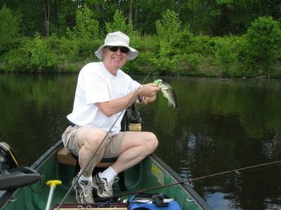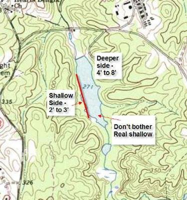 When we pulled up, another guy was just leaving. He said he caught a bunch of smaller bass and typically had good luck on the Pond. That sounded good, so we plopped the basscanoe in the water and got to work. Checking the depth finder as we worked the lake in a counterclockwise direction to leverage the wind direction revealed that the vast majority of this body of water is very shallow as you can see from the map. In fact, it is only worthwhile to fish up at the dam and the eastern side of the lake. The depth there averages about 8 feet off the shore but nothing appeared to be deeper than 13 feet.