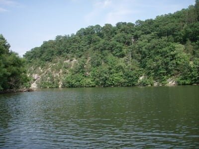 We motored out of the ramp area and turned to the southwest. Since the wind was blowing to the east, I headed the canoe all the way up so we could blow back down the cliff face we wanted to fish. This also made it a lot easier to keep from hooking the BassWife with my fly. This was the second or third time I worked a fly out of the canoe and was still getting the hang of it. It’s tough to work the line from a seated cockeyed position with the handle of the trolling motor poking my back and just waiting to tangle the line.