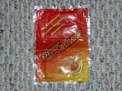 Thankfully, technology has come to the rescue. You can buy chemical heat packs like the one shown below at any Walmart or sporting goods store. The heater is activated by exposure to air. All you do is break the seal, shake and then put in a pocket. In a few minutes time, you will feel a nice warm glow of heat. They are small enough and cheap enough that you can use multiple packs to match your exposure to the cold.