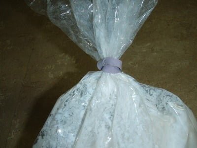 The rubber band allows you to insert the baster and suck in the silica without opening the bag – keeping it out of the air and you out of danger. Be careful!
