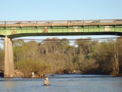 I had not been fishing for a while, and it was a shock to my legs when the cold, 56° water began to swirl around, insisting on pushing me downstream as I moved into the deeper water adjacent to the broad channel that runs up under the center span of the US 1 bridge. Since we decided green and white would be the day’s color, I tied on the double and began heaving my sinking fly line into the center channel. That was about it. I got plenty of practice but not one hit – nothing! One of the other guys claimed to have caught three earlier before we arrived, and I did not see any excitement in the sparse crowd during the four hours Lon and I fished under the bridge.