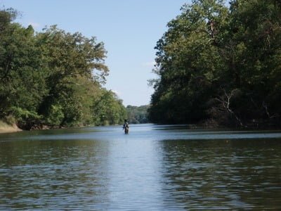 As you can see from the track on the picture above, we did not get that far before we were closed out by shallow water. There was a guy fly fishing at that point, and as we swung by as far away from him as we could get, I asked him if he’d fished here before. He indicated that he had reached the creek from the parking area near where we were floating. He also said that, usually, this spot was more active as a result of the churn coming out of the gradient break that we could see upstream. We moved a little bit farther up to see if we could get through and, failing that, swung back down, apologizing to him if we had spooked his pool. I had the trolling motor on the low speed, and we did swing wide, so I hope we did not disrupt his fishing day.