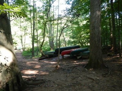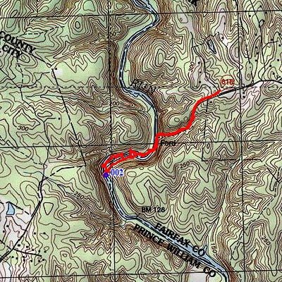 Oh well, I was here. I waited for the group to pass and walked down the trail until I ran across some stacked canoes. After peeking at the river (waypoint 002 on the map), I realized there would be no wading downstream – the water was deep with high banks. I began fishing there and was encouraged by seeing some good-sized bass swimming near a fallen log. It took a while, but I finally convinced a nice one (12″) to fall victim to the Kent’s Stealth Bomber I was throwing. Encouraged by that, I began fishing upstream.