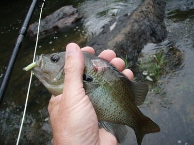 I don’t know why, but I always work upstream, and today was no exception. I began fishing my way upstream, worked the deep pools and the fast run up against the far bank of the river, and continued to pick up decent-sized smallmouth bass as well as as many sunfish as I cared to pull in. This spot is riddled with holes that are deep enough to hold big fish — unfortunately, I could not convince any of them to come out and play. There are plenty of ridges of rocks that run horizontally to the river to give you good footing and provide the ability to move out into the mainstream of the current without sloshing and making a lot of noise. Up around the corner, there’s a huge tree that has fallen parallel to the river and shelters a deep hole with plenty of fish hanging underneath it. It was here that I caught my largest smallie of the day: a 14-inch beauty.