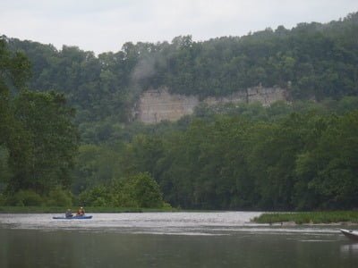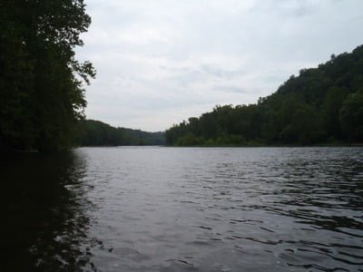 The last major rapid is significant enough to actually have a name – Clendennin Shoals. The outfitter cautioned me to be very alert and watch for a key landmark. The terrain on river right would break from being high forested hills to grass covered steep hills. “When you see the cows on top of the hill, pull right and walk through.” As I paddled downstream, I wondered if I would recognize the landmark without the cows. After all, it was a bad day and they might be inside watching TV. As it turns out, some of the other guys beat me to the rapid (by design) and were holed up on the side waiting for everybody to arrive. None of us had seen any cows and we discussed this particular rapid. Was it the ONE? Nobody knew for sure. I decided to slide down on the right – a good call. I didn’t need to walk the canoe since there was enough water running over the shallow western shoreline to keep me moving without the danger of overturning.