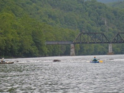 Day 1 VDGIF Description: “Be on your toes for some whitewater action after entering the river at Ripplemead. A Class II rapid awaits approximately one mile form the put in, followed by several more ledges that produce great canoeing fun. A long series of Class II riffles and ledges are located a mile below the confluence of Big Stony Creek. Clendennin Shoals, located near the tow of Pearisburg, is the strongest rapid in the float and provides some excellent opportunities to land a big smallmouth bass or monster flathead catfish. Bragging size muskellunge can also be caught in the deep holes.”