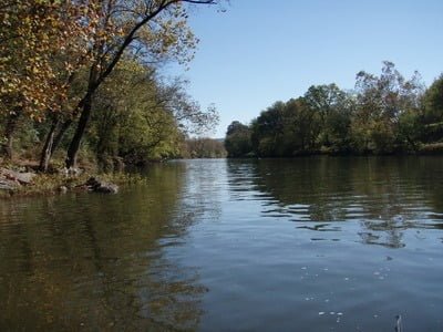 The character of the river changed dramatically as soon as we reached the mainstem. The water in the North Fork was generally opaque — you could not see more than a foot or two below the surface. The mainstem, on the other hand, was crystal clear. You could see all the way to the bottom without any problems at all. We decided to drift our way downstream against the far bank and started to fish standard bass hardware — plastic worms and grubs. The Basswife was using a spinner since the water was deep enough to keep her from being hung up on underwater obstructions.