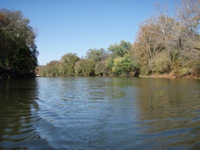Since the current was moving right along, I decided to paddle immediately back to the North Fork as I did not want to have to fight the river for an extended period of time to get back to a launch point. Besides, the Basswife gets cranky if she has to paddle excessively. The current in the North Fork was moderate and manageable for a canoe with paddles. If you are going to use a canoe on this stretch of the river and do not have a trolling motor, be prepared to get some exercise. We paddled and fished our way back up to the launch point and only got a couple of hits. We did not get anything hooked up or into the boat.