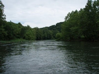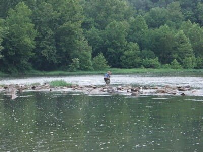 Chris moved downstream and I moved upstream. There’s a deep channel upstream that runs over a great rocky bed with decent sized boulders providing holding areas for fish. The river is wadable on the western side and I moved slowly giving extra attention to the weeds that line that side of the river. The bank drops off from them starkly enough to provide attractive holding positions for bass yet was not too deep to wade. Since the water was milky, I could not get a good eyeball on the depth of the middle and was not motivated to move out there given the swiftness of the current after the rainfall. I fished upstream to the end of the bend, and I could see folks from the private campsites moving out into the riffle farther upstream to begin their day of fishing. At this point, it started to rain again so I returned to the truck, and we continued our recon downstream.