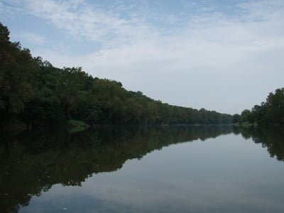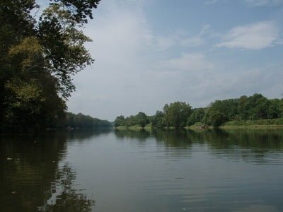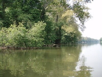 Given the Basswife’s concern about rapids and fast water, I immediately decided to motor upstream. The river upstream from the bridge is fairly lake-like. It runs deep enough to use the trolling motor on the canoe, yet the current is not overpowering. Finally, there are no rapids that would concern the Basswife. A quick look downstream revealed that the gradient increases in that direction as the river runs over a 50-yard stretch of shallow riffles. Given the choice of making the Basswife get her feet wet, dragging the canoe back over that shallow stretch or not, I chose “or not” and maintained peace in our times. With that, we launched the basscanoe into the current and began the slow churn upstream at 2 miles an hour.