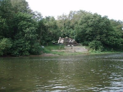Downstream looking back to the bridge. The launch is to the right