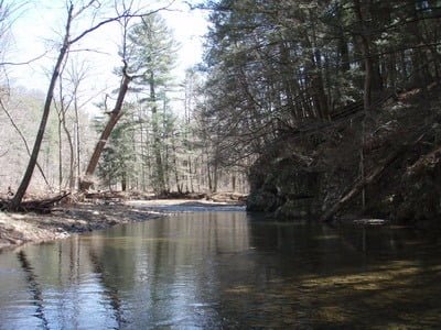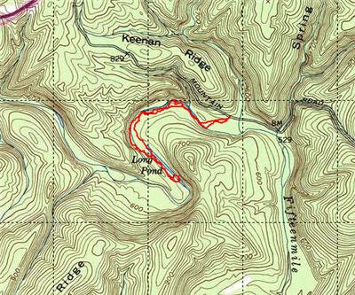 I fished a few good looking spots with neither luck nor skill. With only about 30 minutes left before I had to turn for the truck, I walked upstream to see how far I could get and what was up there. I was stunned to see a huge lake where the creek spread out in a deep area. The water depth here ranged up to 10 or more feet judging from the deep color of green in spots. It stretched for a good 100 yards. Later, I returned to the map and saw that this is actually a named feature – Long Pond. There have to be fish in here. If smallies were to get in here, they could live a happy life.