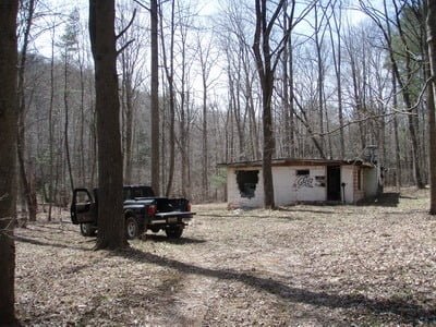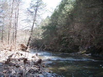 We ran up to Exit 64, got off heading south, and immediately bumped onto a dirt road. This is 4×4 country. While you can probably bounce down this road in a Ford Taurus or any other car you don’t really care about, the best way to penetrate is with a bit higher ground clearance. The road swings down to the river and a flock of “posted” signs. We were across the river from the group I commented on in the upper 15 mile creek posting.