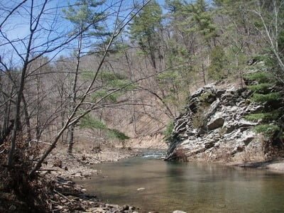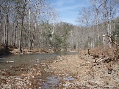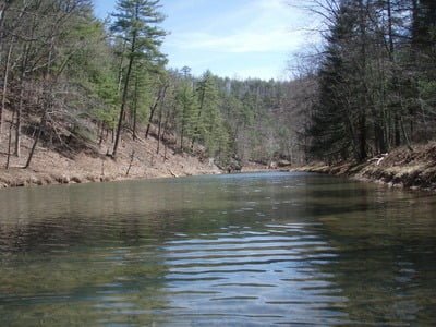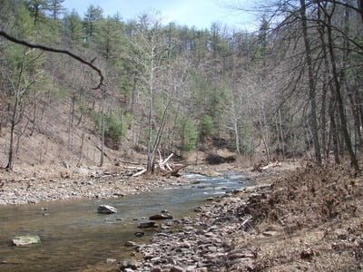 In general, the creek in this section is very wide – up to 60 feet in places. It is mostly shallow. You need to walk to the bends or along the bank paying attention to the water to look for the deep spots. The bottom is rocky, which should mean there is plenty of forage in the water to support a fish population. The only downside to this water for trout is the summer warmth.