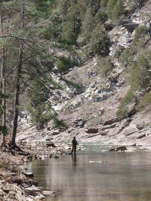 Not knowing that, we hit the river north of the campground. I was immediately impressed by the quality of the water and the scenery here. It was a stark contrast to the upper section. In this area, it was canyon-like with sheer cliff faces thrusting out of the northern bank with high hills protecting the southern approach. Nice.