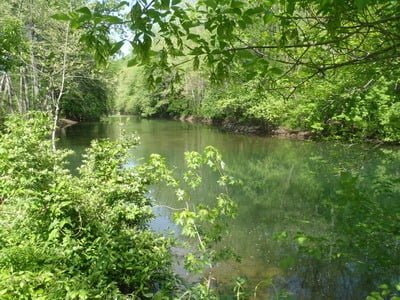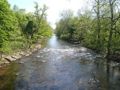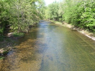 The next spot is below the Pennsylvania border at the Forest Grove Road bridge crossing. Go across the bridge and Park on Kings Grove Road on the east side of the creek. Follow the fisherman’s trail that leads directly downstream from the western bank to reach the river. There is additional easy access on the other side via numerous dirt roads created by the dirt biking fanatics that cut wide paths through the trees. The creek runs about 50 feet wide and flat over a bottom that mixes small rocks and sand. There is a deep cut in the middle that is fishable by moving out onto the shelf above the bridge. The eastern bank slopes gradually up to join the heavily vegetated shoreline. Unlike farther downriver, the shoreline is not congested to the point of preventing movement. The view downstream is favorable. A massive gradient break creates a broad riffle where the river tightens up and narrows.