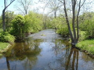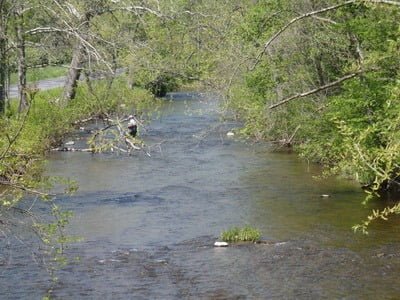 Continue north towards Pennsylvania and stop at Ferguson Lane. There is good parking on both sides of the bridge, with the fisherman’s trail leading to the creek from the western side. As it moves under the bridge, the water deepens, and the creek broadens, becoming almost 50 feet wide with a nice set of riffles and a fallen tree structure at the upstream bend.