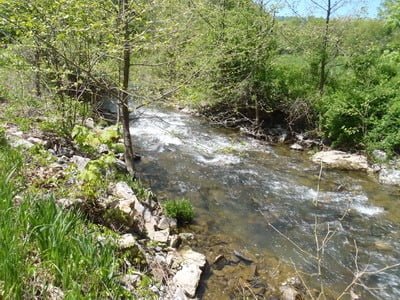 Flintstone Creek is a pretty freestone stream that winds its way north toward the Pennsylvania border. The stocked section starts at the northern boundary of the school on the south side of National Pike NE (MD 144) and gives anglers their first opportunity to reach the water. There is a Veterans Memorial at the intersection of Black Valley Road and National Pike adjacent to the creek, surrounded by thick, almost impenetrable brush. Rather than bushwhack through, drive 200 feet north toward the Interstate to pull into the expansive parking lot shaded by the highway overpass. The creek runs 25 feet wide, clean, and shallow across a rocky bottom, with the immediate deep channel on the eastern side snuggled up to the cliff. To fish, you must wade. There is no easy path next to the bank, and the thick vegetation defeats any thought of not getting wet.