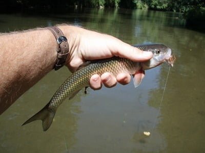 The river is much tighter here than above the bridge – only about 20 feet wide. That makes casting a little bit sporty, and you have to align yourself pretty much up and downstream, or you’ll snag your fly in the trees that cluster on both banks. My friend from the bridge recommended that I work the rock wall next to the road. It was certainly easy to find – about 30 feet up from the parking lot. So, I started to flip a grasshopper pattern in that direction when I hit the water. Within a couple of casts, I was rewarded with a huge splashing strike on the surface and was excited at the prospect of catching my first trout of the day. But, as I got the fish closer, it was a huge fallfish. Granted, those guys give up a bit of a fight, but even with that, it’s still a disappointment when you have your heart set on either a smallie or a nice trout.