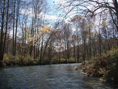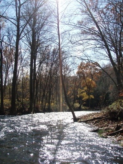 I continued to fish upstream and was happy to see that it was easy to wade over the smooth, rocky bottom. Given the strength of the flow after the rains, I was glad I had my wading staff for additional leverage. I continued to fish until I could see the distant bridge that marks the start of the Prettyboy section. Even though I was skunked, I decided to call it a day and head back to the parking lot. At least the weather was perfect, and the scenery was fantastic. It was great to see the sun wrapping the remaining fall leaves in light and putting a sparkle on the water.