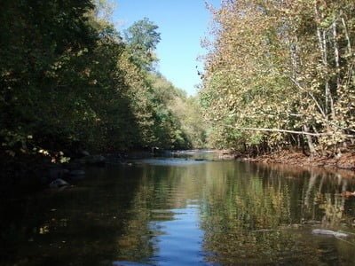In general terms, the north side of the river is the deep side. Since the banks are really high and steep, you have to find a place to get into the riverbed and work your way across. Once on the southern side, you can hit the opposite bank easily. There are overhanging trees in many places, but not enough to make casting a challenge. This is good beginner water and will be forgiving regarding sloppy back casts.
