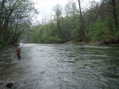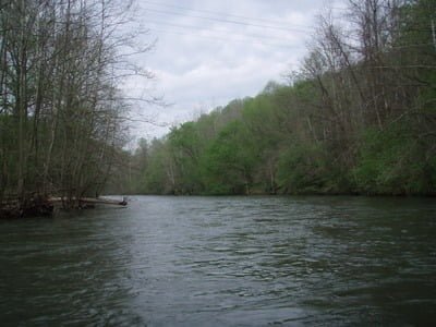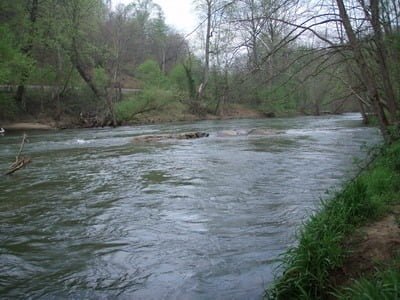 “The river is low in gradient, shallow and rocky with scattered deep pools and sandy runs. The many boulders provide pocket water that provide excellent habitat for the stocked trout and smallmouth bass.”