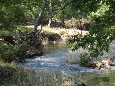 The stream bottom is a mix of rocks and sand with plenty of deeply undercut banks providing holding locations for the wild population of small brown trout that happily inhabit this water. The banks run three to four feet high and slope gradually to the stream. Tall grass grows to the water’s edge, making this an ideal location to flip terrestrial flies. Look for deep pools at the bends. Trees throw shade on the water, but they are not thick enough to present an obstacle to casting as long as you wade. Likewise, walk along the stream to find the best places to fish since the best spots are not visible from the trail. Since the wild trout are skittish, exercise stealth or resign yourself to sweating without a payoff.