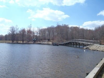 Wheatley Lake (aka Gilbert Run Lake) is the centerpiece of the 180 acre Gilbert Run Park. It is an older, mature body of water constructed 40 years ago as a floodwater management impoundment. After paying the entrance fee, take the left fork in the road to drive up to the children’s play area (the first right) or continue around the lake to park near the main concession operation near the fishing piers. There The well-developed concession area includes pavilions, picnic tables and barbecue areas as well as two volleyball courts. Along the shoreline, there are plenty of benches that will be fully occupied by busy anglers during the trout stocking season.
