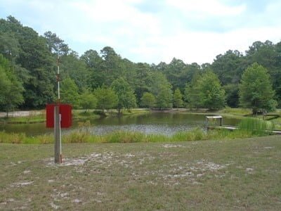 While tiny, the pond features the standard easy accessibility that anglers expect in Maryland. The bank is gentle and rolls easily down to the shoreline, where the bottom drops off quickly to an uncertain depth. Three small fishing piers enable disabled anglers and children to fish without dodging the small amount of vegetation that grows along the bank. Clusters of large trees break up the monotony created by the wide, sandy path that facilitates movement. After the season warms up, grass grows with abandon to the edge of the mowed section.