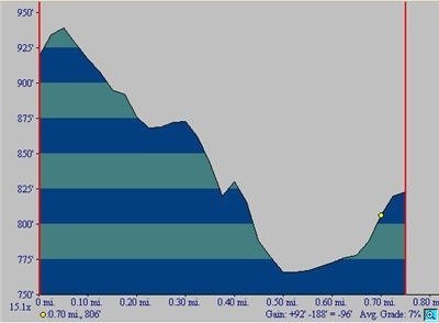 Red line marks my fishing trail. The graph below shows the vertical gain over the hike. The graph looks dramatic only because it is 3/4 mile squished into a small space. Total vertical was only 188 feet.