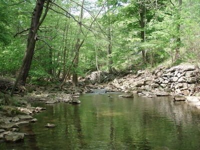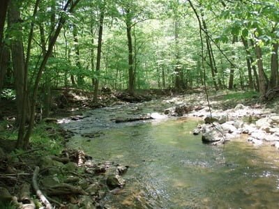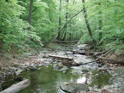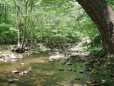 I was greeted by a scenic view of a small creek shaded by a full canopy of dense trees. The books were right. The trees would be thick enough to keep the water reasonably cold and possibly encourage the survival of a trout or two in the warmth of a Maryland summer.