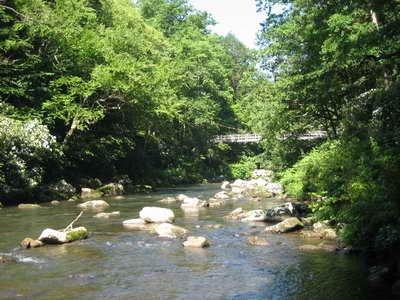 Looking north from the parking area to the suspension bridge that marks the boundary of the special regulation area between flies and lures.
