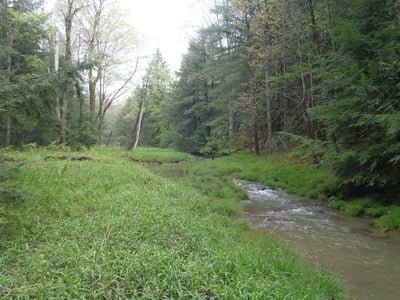 Mudlick Run is a small trout stream that winds its way through a series of beaver ponds (39.648372,-79.028988 and 39.643635,-79.023109) to eventually contribute its flow to the headwaters of the Savage River. From the parking lot, follow the Mount Aetna loop trail (red trail) to the left. It parallels Mudlick Run until it turns to the right near 39.656229,-79.028929 to circle around the top of the mountain to return to the parking lot. The trail provides an easy way to make big moves from place to place. However, once you begin fishing, it is easier to leave the stream and wander through the prolific explosion of tall grass near the water to jump to another spot.
