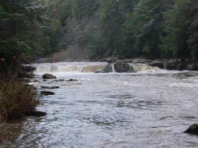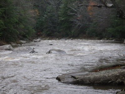 I saw that the DNR had plopped 65 six pounders into the Yough up near Swallow Falls, so our first stop of the day was over there to go elephant hunting. After rigging up, we headed over to the bridge to check out the water. Nasty. Brown and fast. Remembering that everyone else seemed to fish to the north, we walked down to Swallow Falls to check out the water. Still pretty bad. No clarity to the chilly, 44 degree water at all and the current was like a riptide.