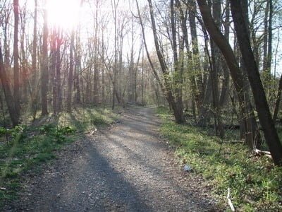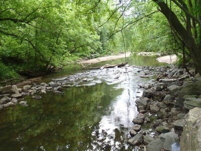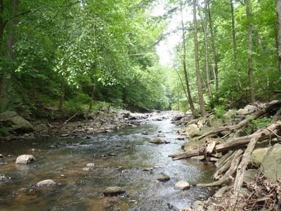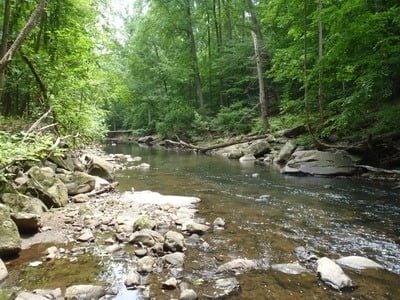 The road dead ends at a small, three-car parking area that connects with a narrow, two-foot wide trail at its southern end. Follow the path through the intersection with the Rachel Carson Trail down to the stream. After following it for 0.1 miles with a vertical drop of only 10 feet, it begins to parallel the water. At this point, the stream runs over a gravel bottom with a few random larger rocks and is approximately 20 feet wide. There are several good pools at the junction of the trail with the best place being near a rock wall.