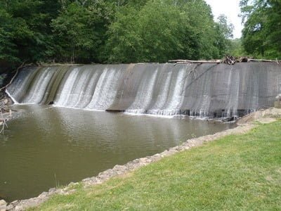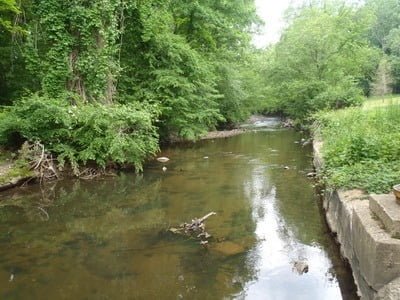 This is the major access point adjacent to the old gristmill (Bealle’s Mill) with parking on both sides of the highway. There is a dam on the north side of the road (Old Burnt Mills) that creates one of the rare deep-water sections on the stream with a massive fallen tree on the west side providing interesting structural scenery. Access to the bank is limited due to the deep water. The shoreline vegetation is thick and will require you to pick your fishing location carefully. The stream is approximately 50 feet wide with the deep section extending approximately 1,500 feet upstream. This is the place to fish for bass during the summer.