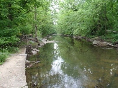 The access point is adjacent to an open field with manicured grass cradling the 10-foot-wide asphalt path leading to the stream. A walk of 0.1 miles/25 foot vertical drop puts you on the stream adjacent to a fully asphalted path. The stream continues the rocky characteristic that began upstream at the Beltway with a small amount of sand buffering the rocks on the bottom. The banks are steep and the water runs shallow with widely dispersed gradient breaks that create deeper pools. The best place to get into the water is adjacent to a small, roofed gazebo a small distance downstream from the intersection of the access path with the trail. If you fish using a bike to quickly move from place to place, this is a good place to start since bikes are not permitted on the trail above the Beltway.